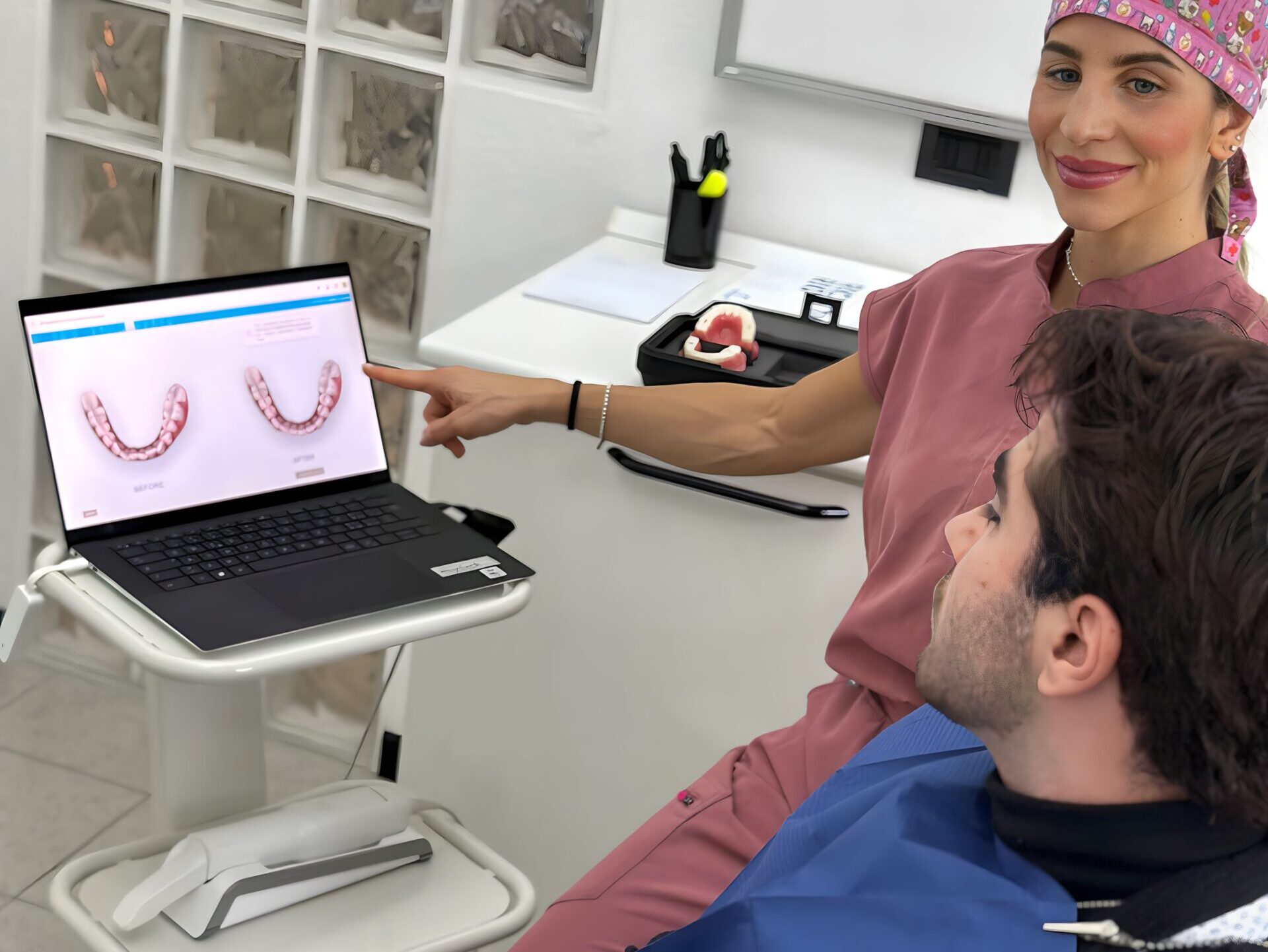 Permette la sostituzione di elementi dentari mancanti o compromessi con perni in titanio inseriti nelle ossa mascellari , su cui vengono montati corone artificiali simili a denti.